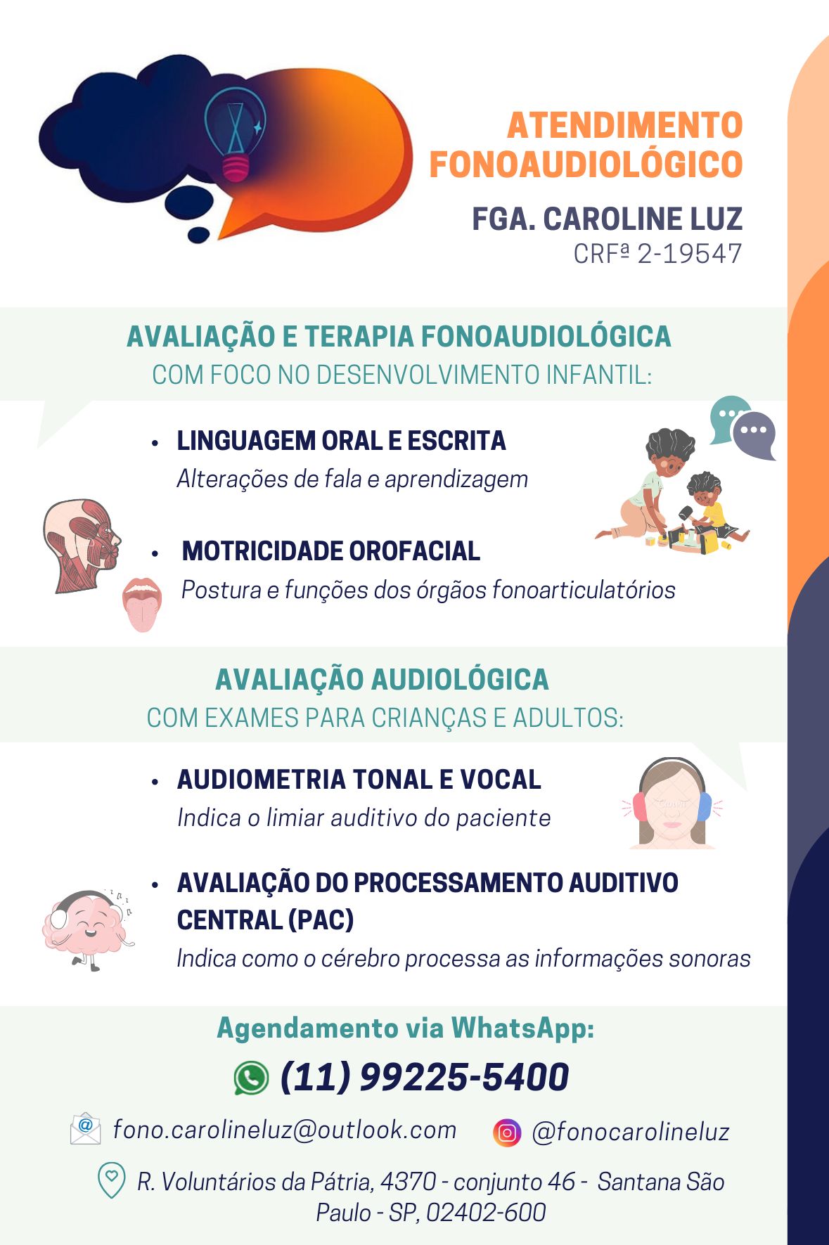 Atuo com terapia fonoaudiológica há 9 anos, atendendo o público infantil, com foco maior nas áreas de fala, linguagem e motricidade orofacial.